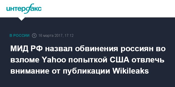 Москва. 16 марта. INTERFAX.RU - Обвинение Вашингтоном двух сотрудников ФСБ России во взломе 500 млн аккаунтов пользователей Yahoo в МИД РФ расценивают как попытку увести внимание от последней публикации Wikileaks.