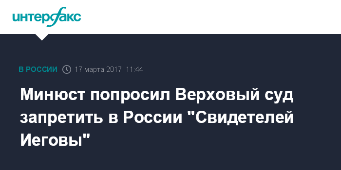Накануне в пресс-службе Верховного суда РФ "Интерфаксу" сообщили, что Минюст просит признать религиозную организацию "Управленческий центр Свидетелей Иеговы в России" экстремистской и запретить в стране ее деятельность. Дата рассмотрения иска министерства пока не назначена. В свою очередь в организации заявили, что пока не получали из суда никаких документов, но считают, что "если иск будет удовлетворен, это повлечет за собой катастрофические последствия для свободы вероисповедания в России".