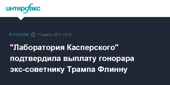 Москва. 17 марта. INTERFAX.RU - "Лаборатория Касперского" подтверждает выплату своей дочерней компанией гонорара экс-советнику президента США по нацбезопасности Майклу Флинну за выступление на форуме в Government Cybersecurity Forum в Вашингтоне в 2015 году.