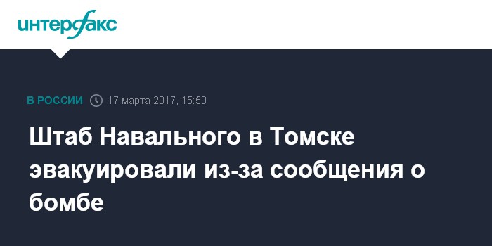 Москва. 17 марта. INTERFAX.RU - Избирательный штаб оппозиционера Алексея Навального в Томске эвакуируют из-за сообщения о бомбе, сообщила в пятницу пресс-секретарь оппозиционера Кира Ярмыш в своем твиттера.