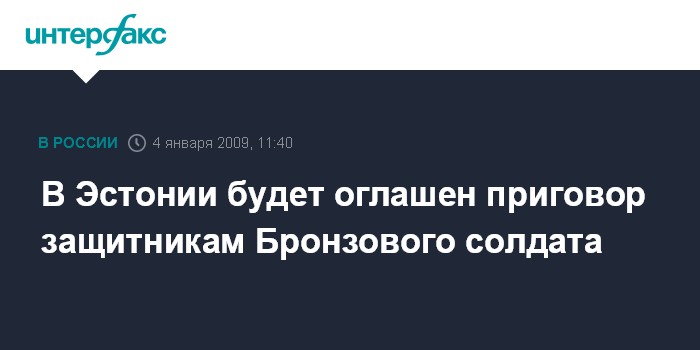 Москва. 4 января. INTERFAX.RU - В Эстонии в понедельник, 5 января будет оглашен приговор лидерам и активистам общественного движения в защиту памятника Воину-освободителю Таллина от фашистов "Ночной дозор", обвиняемым в организации массовых беспорядков в апреле 2007 года.