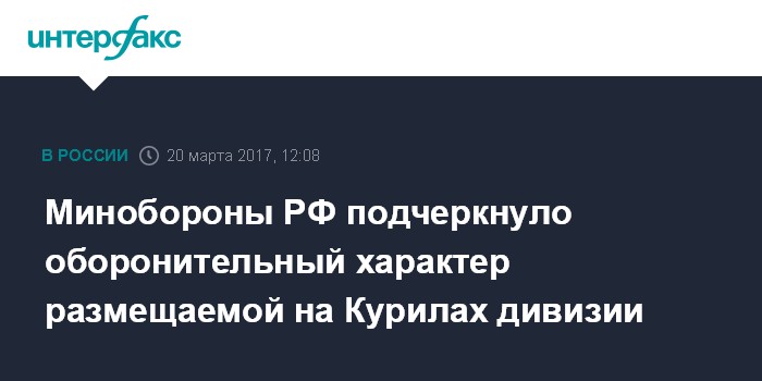 Москва. 20 марта. INTERFAX.RU - Дивизия на Дальнем Востоке, в том числе на Курильских островах, создается исключительно для защиты территории России. Об этом сообщил министр обороны РФ Сергей Шойгу на пресс-конференции по итогам российско-японских переговоров в формате "2+2".