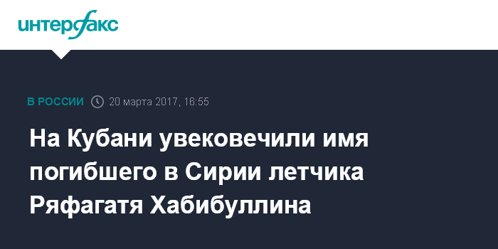 Москва. 20 марта. INTERFAX.RU - Памятник погибшему в Сирии Герою России, командиру 55-го вертолетного полка Ряфагатю Хабибуллину торжественно открыт в понедельник в городе Кореновске Краснодарского края, сообщила пресс-служба администрации региона.
