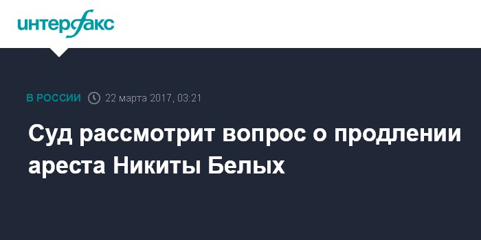 Москва. 22 марта. INTERFAX.RU - Басманный суд Москвы в среду рассмотрит ходатайство следствия о продлении ареста экс-губернатора Кировской области Никиты Белых, обвиняемого в получении взятки. Как ранее сообщили "Интерфаксу" в суде, следственные органы обратились с ходатайством о продлении срока ареста Н.Белых на три месяца, до 24 июня.