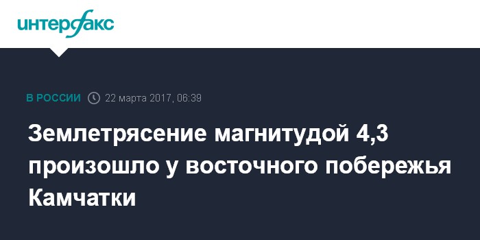Москва. 22 марта. INTERFAX.RU - Сейсмологи зарегистрировали землетрясение магнитудой 4,3, произошедшее в Тихом океане у восточного побережья Камчатки, сообщили агентству "Интерфакс - Дальний Восток" в Камчатском филиале Геофизической службы РАН.