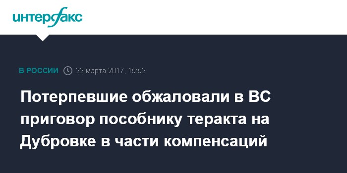 Москва. 22 марта. INTERFAX.RU - Представители потерпевших по делу о захвате в 2002 году заложников в театральном центре на Дубровке обжаловали в Верховный суд (ВС) РФ приговор пособнику террористов Хасану Закаеву.