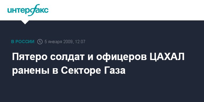 Москва. 5 января. INTERFAX.RU - Пятеро солдат и офицеров вооруженных сил Израиля (ЦАХАЛ) получили ранения различной степени тяжести в ходе военной операции на севере сектора Газа в понедельник утром, говорится в сообщении, размещенном на вебсайте газеты "Джерузалем пост".