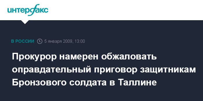 Москва. 5 января. INTERFAX.RU - Сторона обвинения на судебном процессе по делу защитников памятника Воину-освободителю Таллина от фашистов не исключает обжалования в окружном суде вынесенного в понедельник оправдательного приговора.