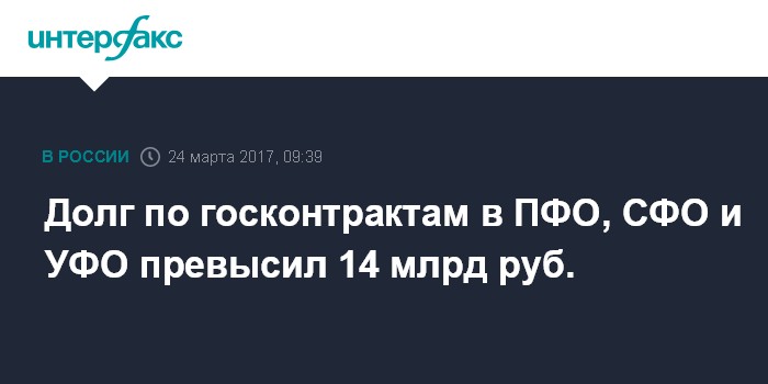 Москва. 24 марта. INTERFAX.RU - Долги по заключенным государственным и муниципальным контрактам в Приволжском, Сибирском и Уральском федеральных округах, по данным на 1 марта, составили 14,3 млрд рублей, сообщил генеральный прокурор РФ Юрий Чайка на совещании по вопросам защиты прав предпринимателей, прошедшем в Екатеринбурге в пятницу.