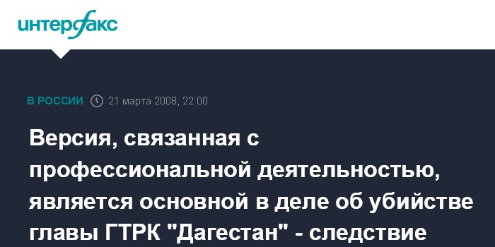 Ростов-на-Дону. 21 марта. ИНТЕРФАКС-ЮГ - В качестве основной версии убийства гендиректора ГТРК "Дагестан" Магомедгаджи Абашилова рассматривается его профессиональная деятельность, сообщил агентству "Интерфакс-Юг" в пятницу официальный представитель прокуратуры республики Дагестан.