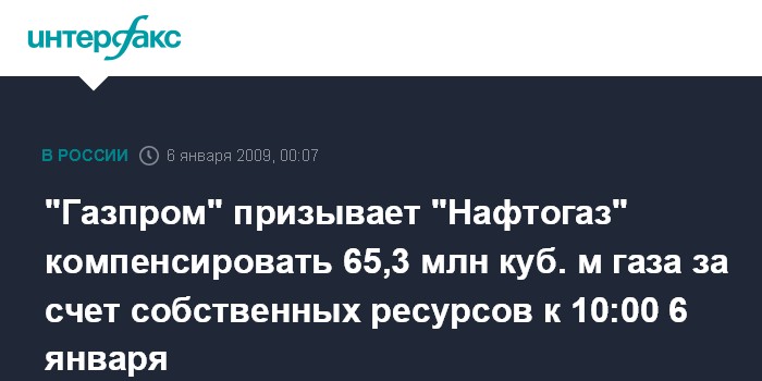 Москва. 6 января. ИНТЕРФАКС - ОАО "Газпром" призвал "Нафтогаз" компенсировать 65,3 млн куб. м газа путем его подачи на западную границу Украины до 10:00 6 января за счет собственных ресурсов, говорится в распространенном заявлении управления информации "Газпрома".