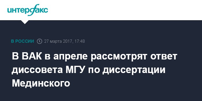 Москва. 27 марта. INTERFAX.RU - Экспертный совет по истории Высшей аттестационной комиссии рассмотрит ответ диссертационного совета МГУ на вопрос о диссертации министра культуры РФ Владимира Мединского в апреле. Об этом сообщили "Интерфаксу" в пресс-службе председателя ВАК Владимира Филиппова.