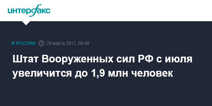 Москва. 29 марта. INTERFAX.RU - Президент России Владимир Путин своим указом увеличил с 1 июля 2017 года штатную численность Вооруженных Сил страны до 1 903 051 человека, в том числе 1 013 628 военнослужащих.