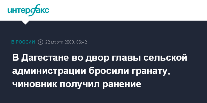Дербент (Дагестан). 22 марта. ИНТЕРФАКС-ЮГ – Неизвестные бросили ручную гранату во двор домовладения, где проживает глава администрации села Перекей, сообщили агентству "Интерфакс-Юг" в Дербентском РОВД.