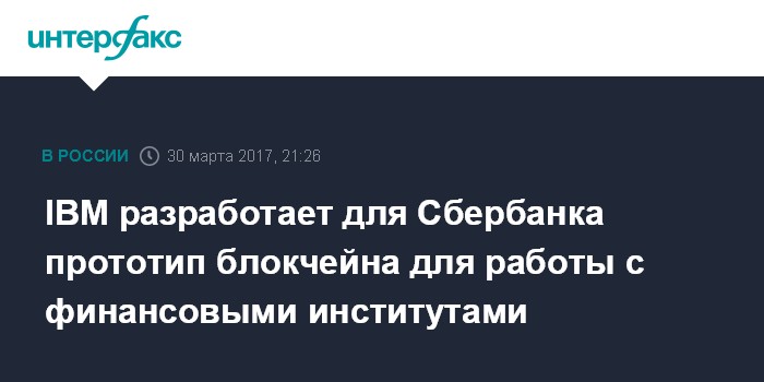 Москва. 30 марта. INTERFAX.RU - ООО "ИБМ Восточная Европа/Азия" (корпорация IBM) выбрано единственным поставщиком по закупке Сбербанком России прототипа модуля блокчейн на платформе Hyperledger, следует из документации банка.