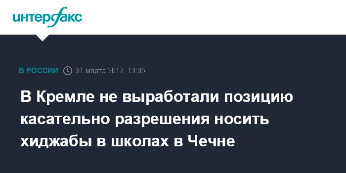 Москва. 31 марта. INTERFAX.RU - Пресс-секретарь президента РФ Дмитрий Песков заявил, что Кремль пока не сформулировал свою позицию относительно закона, принятого парламентом Чечни, который разрешил учащимся одеваться в соответствии с вероисповедованием, в том числе носить хиджабы.