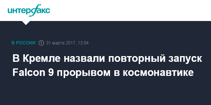 Москва. 31 марта. INTERFAX.RU - В Кремле заявили, что внимательно следят за прорывными событиями в области ракетно-космических технологий, назвав полет ракеты Falcon 9 важным достижением.