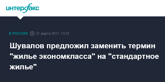 Москва. 31 марта. INTERFAX.RU - Первый вице-премьер РФ Игорь Шувалов предлагает заменить термин "жилье экономкласса" на "стандартное жилье".