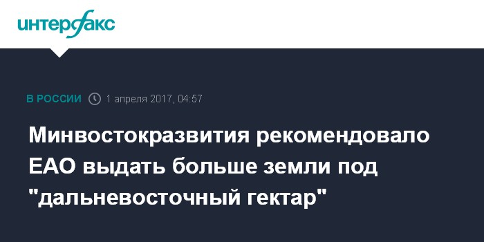 Москва. 1 апреля. INTERFAX.RU - Министр РФ по развитию Дальнего Востока Александр Галушка рекомендовал властям Еврейской автономной области (ЕАО) увеличить площадь земель, разрешенных к выдаче в рамках "дальневосточного гектара", сообщило Минвостокразвития.