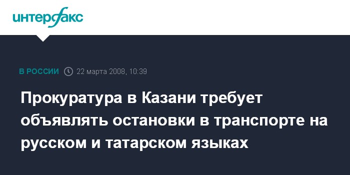 "В прокуратуру Авиастроительного района Казани обратился гражданин, который пожаловался на то, что в общественном транспорте не соблюдаются требования закона Татарстана о языках, гарантирующего равноправие двух языков. В частности, не во всех автобусах, трамваях и троллейбусах объявляются остановки на татарском языке", - сообщил агентству "Интерфакс-Поволжье" старший помощник прокурора Татарстана Равиль Вахитов.