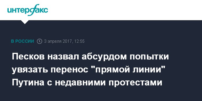 Москва. 3 апреля. INTERFAX.RU - Версия о том, что перенос "прямой линии" с президентом РФ Владимиром Путиным на более поздний срок связан с недавними акциями протеста, прошедшими в РФ, неправдоподобна, увязывать эти события абсурдно, заявил пресс-секретарь президента РФ Дмитрий Песков.