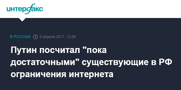 Москва. 3 апреля. INTERFAX.RU - Президент РФ Владимир Путин считает, что существующих ограничений в российском интернете достаточно, возможные дополнительные меры должны обсуждаться с общественностью.