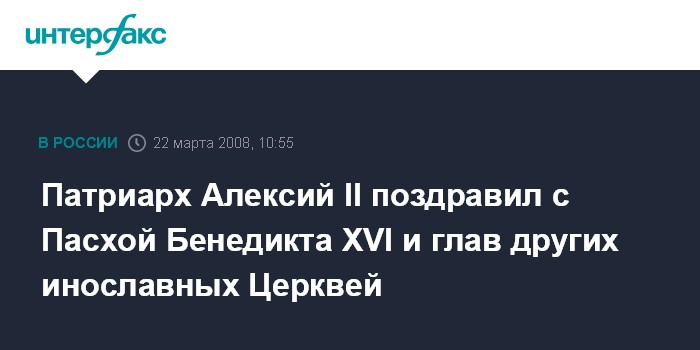 Москва. 22 марта. ИНТЕРФАКС - Патриарх Московский и всея Руси Алексий II поздравил с наступающей Пасхой папу Римского Бенедикта XVI и глав других Церквей, которые готовятся отметить Воскресение Христово 23 марта.