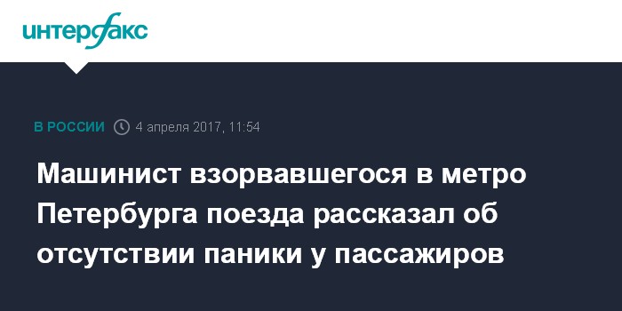 Москва. 4 апреля. INTERFAX.RU - После взрыва в поезде петербургского метро пассажиры не создали панику, состав дошел до следующей станции без замедления, сообщил журналистам во вторник машинист поезда, в котором 3 апреля произошел взрыв, Александр Каверин.