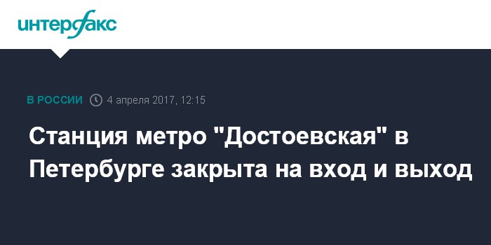 Москва. 4 апреля. INTERFAX.RU - Станция петербургского метрополитена "Достоевская" закрыта для пассажиров на вход и выход, сообщает пресс-служба ГУП "Петербургский метрополитен".