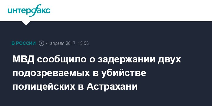 Москва. 4 апреля. INTERFAX.RU - Двое подозреваемых в убийстве полицейских задержаны в Астрахани. Об этом сообщила во вторник официальный представитель МВД Ирина Волк.