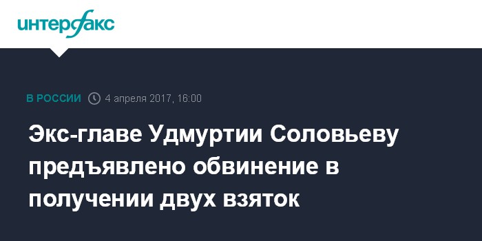 Москва. 4 апреля. INTERFAX.RU - Следователи предъявили бывшему главе Удмуртской Республики Александру Соловьеву обвинение в получении взятки, сообщила "Интерфаксу" во вторник официальный представитель следственного комитета России (СКР) Светлана Петренко.
