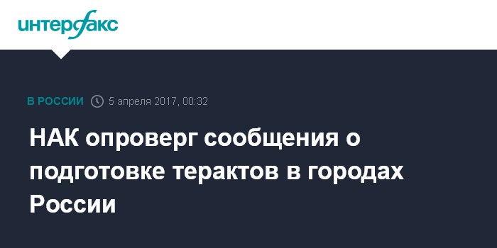 Москва. 5 апреля. INTERFAX.RU - Появившаяся в ряде СМИ и социальных сетях информация со ссылками на неназванные источники в органах безопасности о якобы готовящихся в ряде городов России терактах является недостоверной, сообщает в среду Информационный центр Национального антитеррористического комитета (НАК).