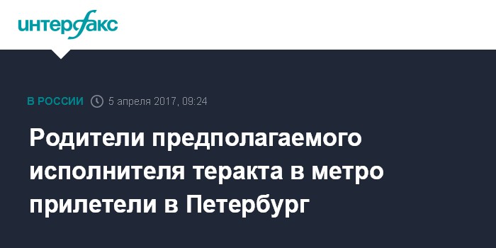 Москва. 5 апреля. INTERFAX.RU - Родители предполагаемого террориста-смертника Акбаржона Джалилова, предположительно взорвавшего бомбу в метро Санкт-Петербурга, прилетели из Киргизии в Северную столицу, передает телеканал "Россия-24" (ВГТРК).
