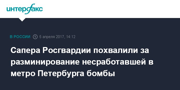 Москва. 5 апреля. INTERFAX.RU - Командующий Северо-Западным округом Росгвардии генерал-лейтенант Сергей Захаркин поблагодарил сапера за работу по разминированию взрывного устройства на станции метро "Площадь Восстания" в день теракта в Санкт-Петербурге, сообщили "Интерфаксу" в департаменте по взаимодействию со СМИ и институтами гражданского общества Росгвардии.