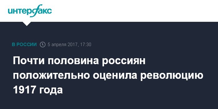 Москва. 5 апреля. INTERFAX.RU - Около половины россиян считают неизбежной Октябрьскую революцию 1917 года и отмечают её положительную роль в истории страны (по 48%), сообщили "Интерфаксу" в "Левада-Центре".