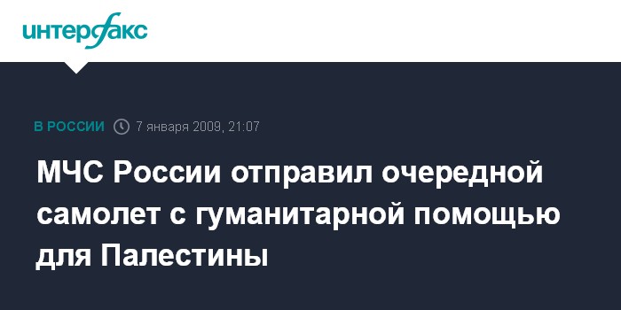 Москва. 7 января. ИНТЕРФАКС - Транспортный самолет МЧС России с грузом гуманитарной помощи - продуктами питания, в том числе детского, а также медикаментами, вылетел в Палестину, сообщил "Интерфаксу" в среду представитель управления информации МЧС России.