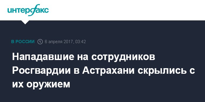 Москва. 6 апреля. INTERFAX.RU - Напавшие на сотрудников Росгвардии в Астрахани отобрали их оружие и скрылись, сообщил агентству "Интерфакс-Юг" старший помощник руководителя СУ СКР по региону Андрей Хегай.