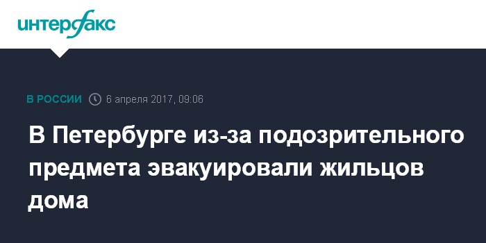 Москва. 6 апреля. INTERFAX.RU - Жильцы дома в Петербурге эвакуированы из-за обнаружения предмета, который может представлять опасность, сообщили "Интерфаксу" в четверг в городском управлении ФСБ.