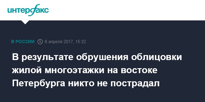 Москва. 6 апреля. INTERFAX.RU - В результате обрушения облицовки жилой многоэтажки на востоке Петербурга никто не пострадал, сообщили в МЧС.