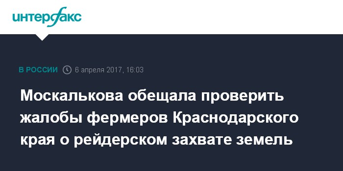 Москалькова обещала проверить жалобы фермеров Краснодарского края о рейдерском захвате земель