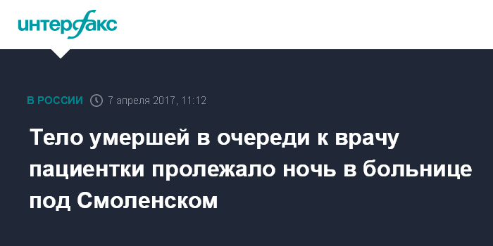 Москва. 7 апреля. INTERFAX.RU - В Гагаринской центральной районной больнице в Смоленской области скончалась стоявшая в очереди жительница региона.