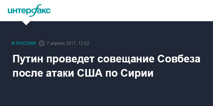 Москва. 7 апреля. INTERFAX.RU - Президент РФ Владимир Путин в пятницу проведет оперативное совещание с постоянными членами Совета безопасности страны в связи с ударами США по Сирии, сообщил пресс-секретарь главы государства Дмитрий Песков.