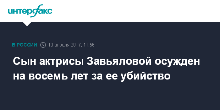 Москва. 10 апреля. INTERFAX.RU - Выборгский районный суд Петербурга признал виновным в убийстве актрисы Александры Завьяловой ее сына Петра, он приговорен к восьми годам колонии строгого режима.