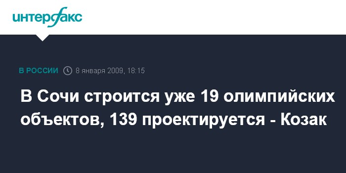 "Из 186 объектов 139 уже проектируются или проектирование завершено, 19 объектов уже строятся", - сказал Д.Козак на совещании при президенте РФ по вопросам подготовки к проведению Олимпиады в Сочи в 2014 году.
