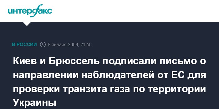 Брюссель. 8 января. ИНТЕРФАКС-УКРАИНА - Украина и Европейская комиссия подписали письмо о направлении европейских наблюдателей с целью мониторинга транзита российского газа через украинскую территорию.