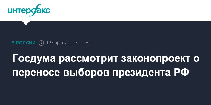 Москва. 12 апреля. INTERFAX.RU - Госдума на заседании в среду рассмотрит в первом чтении поправки в закон "О выборах президента РФ", которые дают возможность назначить ближайшие выборы президента в 2018 году на 18 марта, день возвращения Крыма в состав России. Поправка предлагает установить, что "если воскресенье, на которое должны быть назначены выборы президента РФ, совпадает с днем, предшествующим нерабочему праздничному дню, или это воскресенье приходится на неделю, включающую нерабочий праздничный день, либо это воскресенье в установленном порядке объявлено рабочим днем, выборы назначаются на следующее воскресенье".