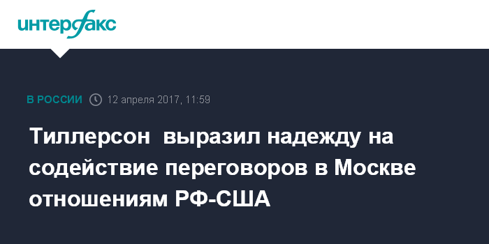 Москва. 12 апреля. INTERFAX.RU - Госсекретарь США Рекс Тиллерсон выразил надежду на то, что его переговоры с главой МИД РФ Сергеем Лавровым в Москве будут содействовать улучшению российско-американских отношений.