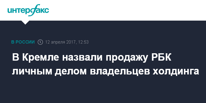 Москва. 12 апреля. INTERFAX.RU - Сделка по продаже РБК - это личное дело частных собственников, Кремль не вмешивается в судьбу холдинга, заявил пресс-секретарь президента РФ Дмитрий Песков.