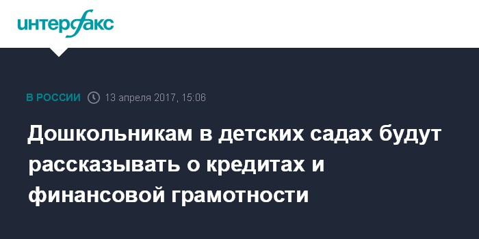 Москва. 13 апреля. INTERFAX.RU - О личных финансах и потребительских кредитах будут рассказывать на уроках по финансовой грамотности не только школьникам и студентам, но и дошкольникам в детских садах России.