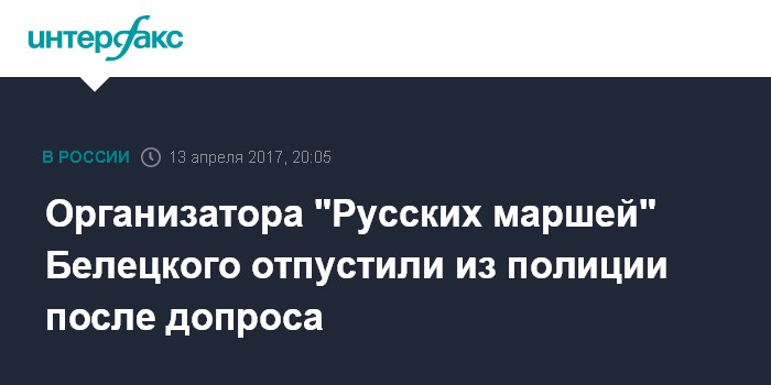 Москва. 13 апреля. INTERFAX.RU - Организатор "Русских маршей" Иван Белецкий вышел из отделения полиции в Москве после допроса в качестве свидетеля по ряду уголовных дел, возбужденных в связи с несанкционированными акциями протеста 26 марта.